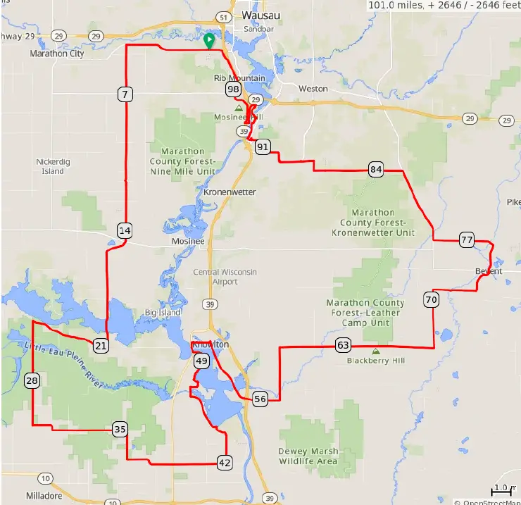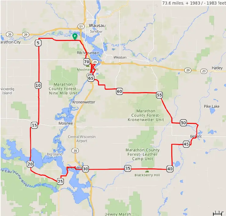 BBFGF routes 2025 Big Bull Falls Grand Fondo Routes 101-mile route See Route DetailsRest Stops1. Meade Wildlife Center (27.3mi.)2. Mullins Cheese Retail Store (51.6mi)3. St. Ladislaus Church, Bevent (73.1mi.)4. Village Crossing Mobil Station, Kronenwetter (89.6mi.)101 mi. & 2647′ of elevation 73-mile route See Route DetailsRest Stops 1. Mullins Cheese Store (28.5 mi.)2. St. Ladislaus Church (46.8mi.)3. Village Crossing Mobil Station (62.3 mi.)73.6 mi. & 1,983′ of elevation 35-mile route See Route Details Rest Stops 1. Rest Stop- Mosinee Elementary School, 15.5 mi. 2. Rest Stop- Village Crossing Mobil Station Hwy X & XX, 24.1mi. 35.5 mi. & 916′ of elevation © All Rights Reserved.